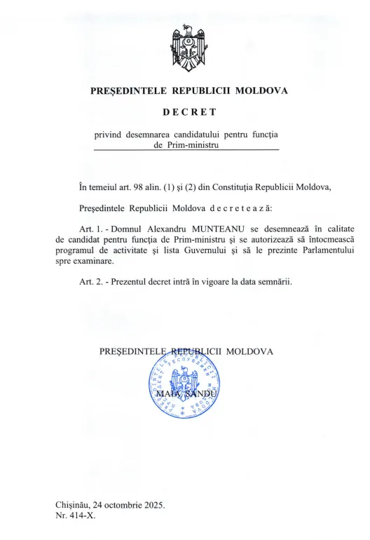 Președinta Maia Sandu l-a desemnat pe Alexandru Munteanu în calitate de candidat pentru funcția de prim-ministru al Republicii Moldova. Șefa statului a semnat un decret în acest sens după consultările cu fracțiunile parlamentare.