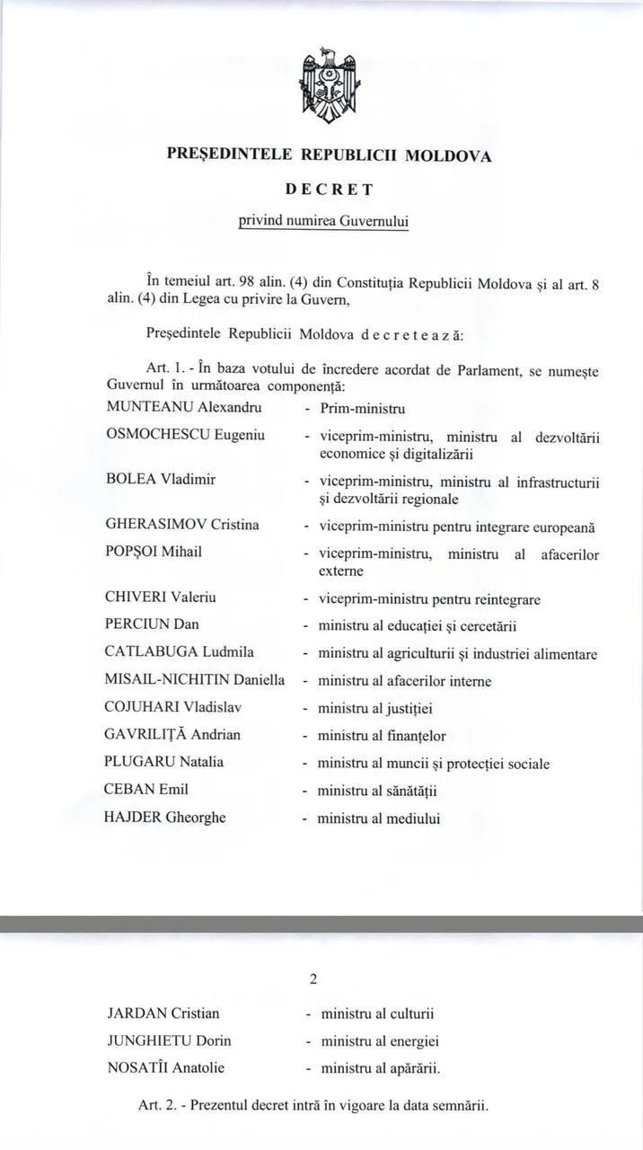 Noul Guvern în frunte cu Alexandru Munteanu a fost învestit oficial în funcție sâmbătă, 1 noiembrie. După desfășurarea ceremoniei, Maia Sandu a semnat decretul.
