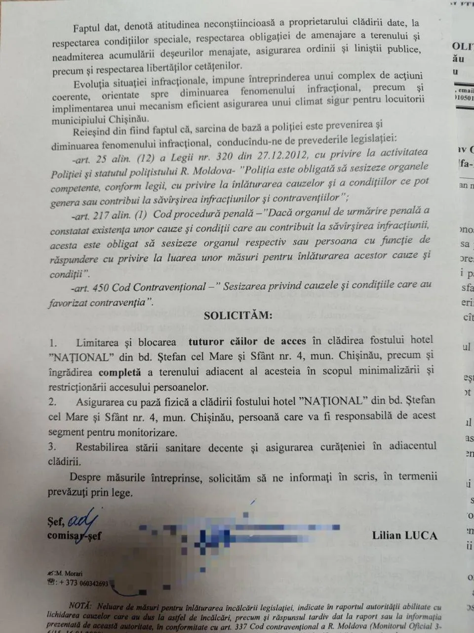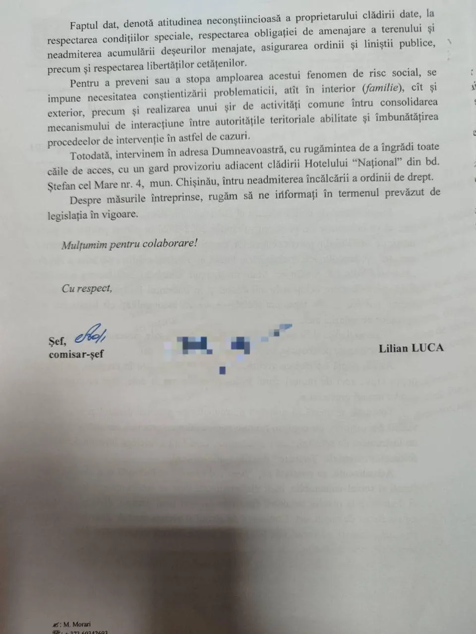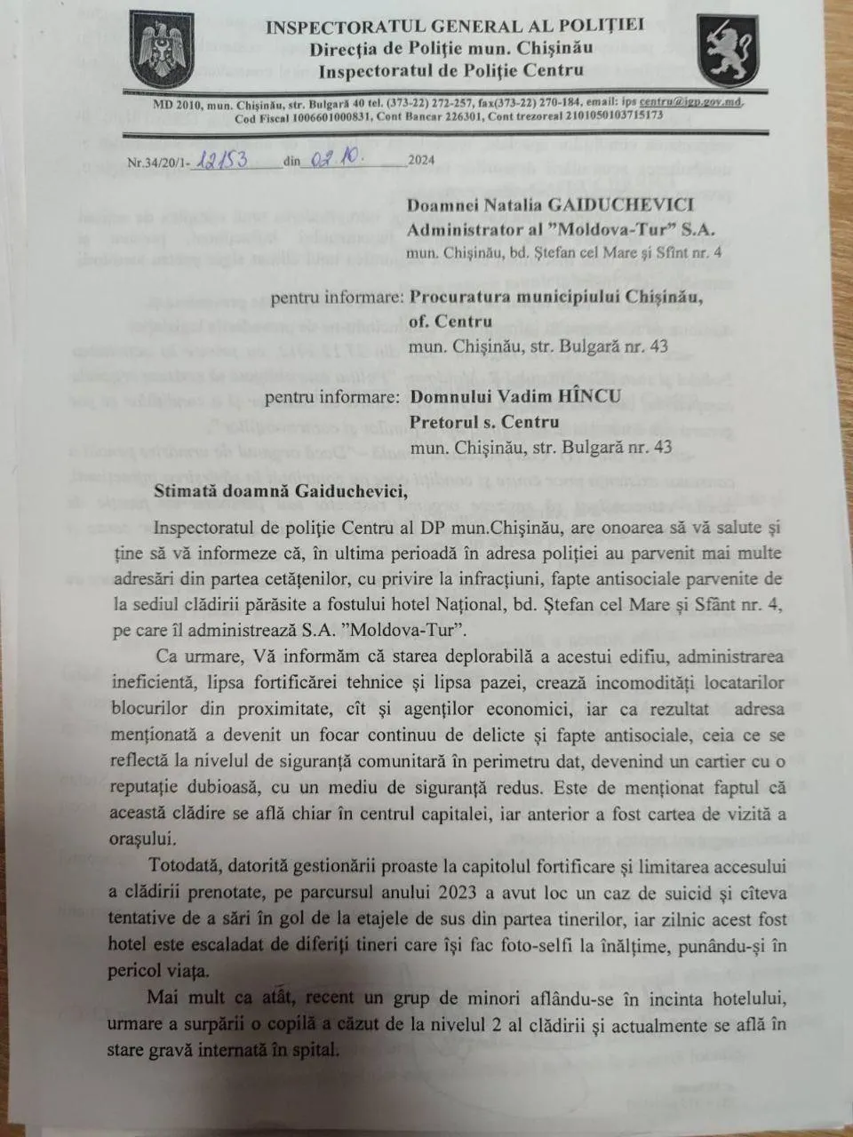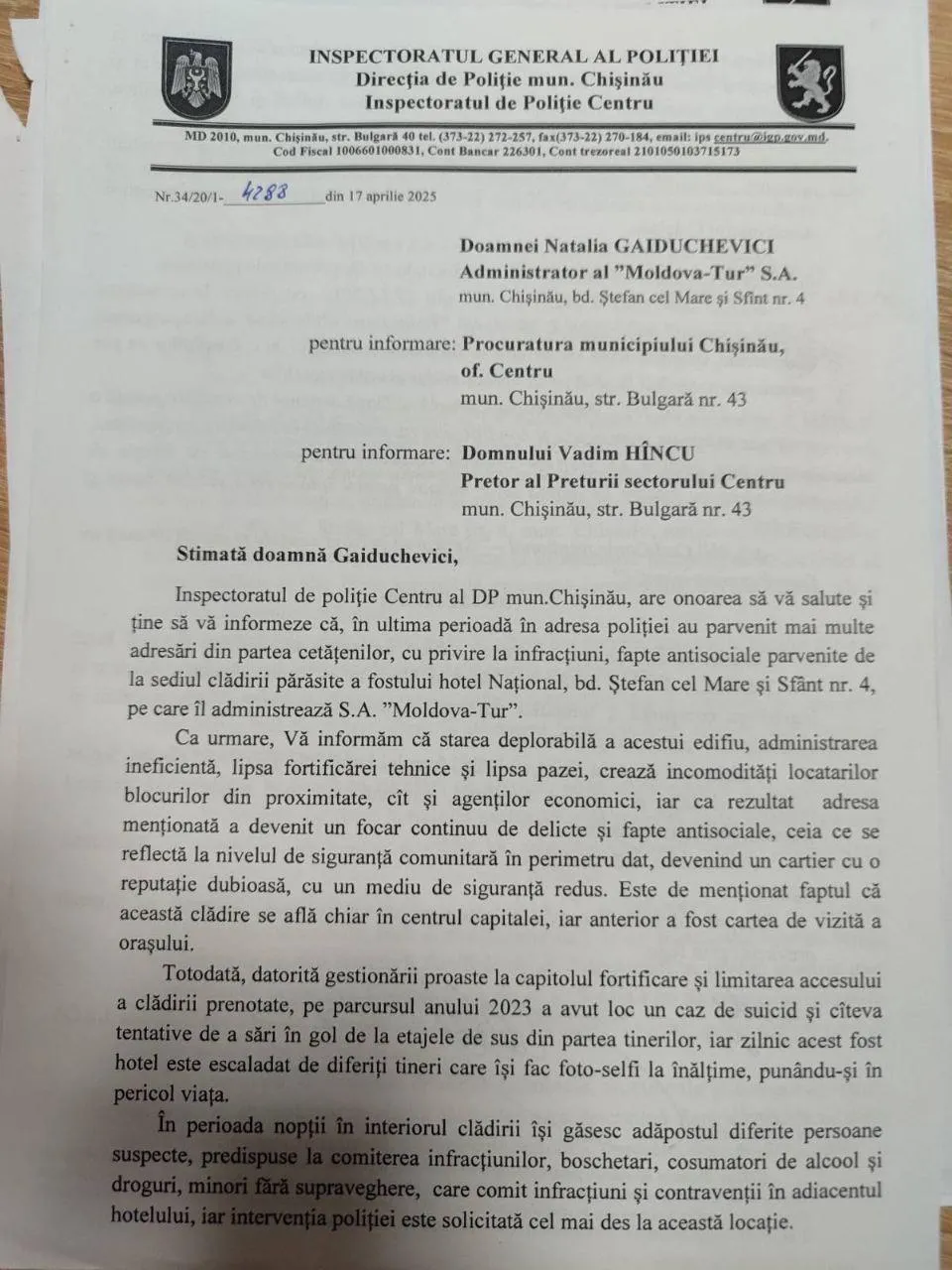 Totodată, au fost trimise numeroase sesizări către SRL „Moldova-Tur”, administratorul clădirii, pentru a securiza accesul și a împiedica intrarea persoane.