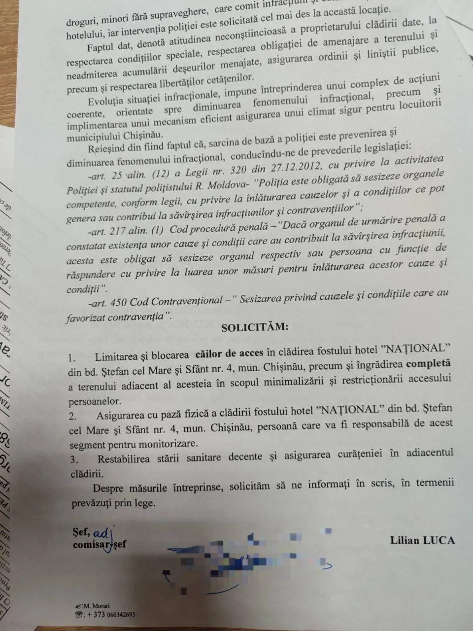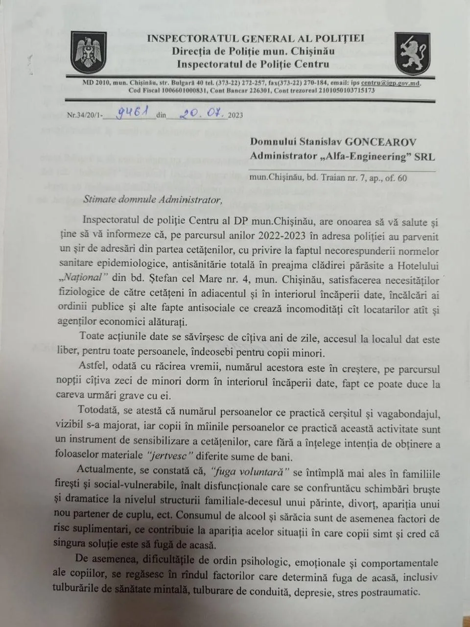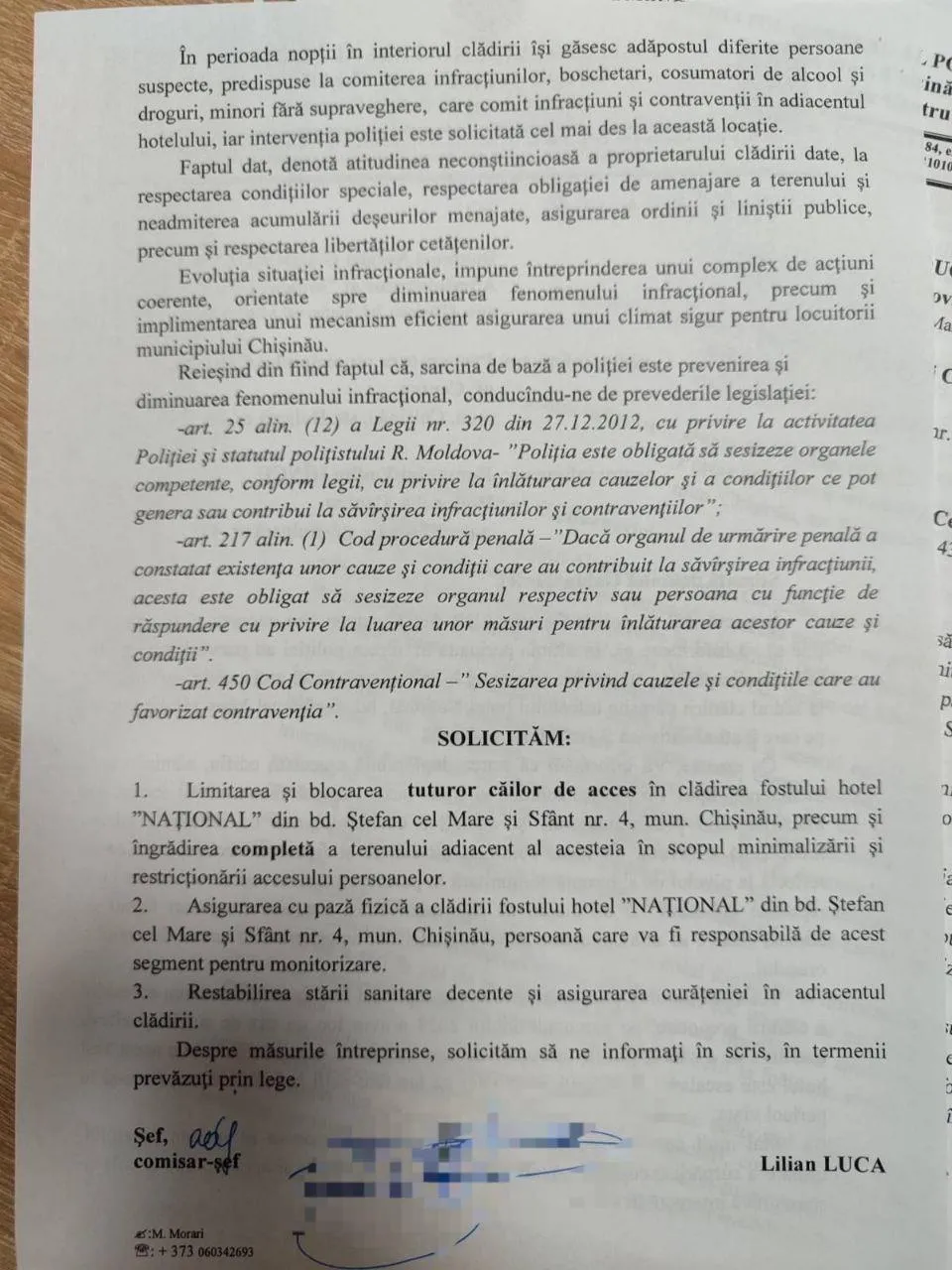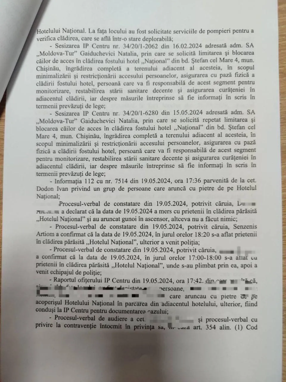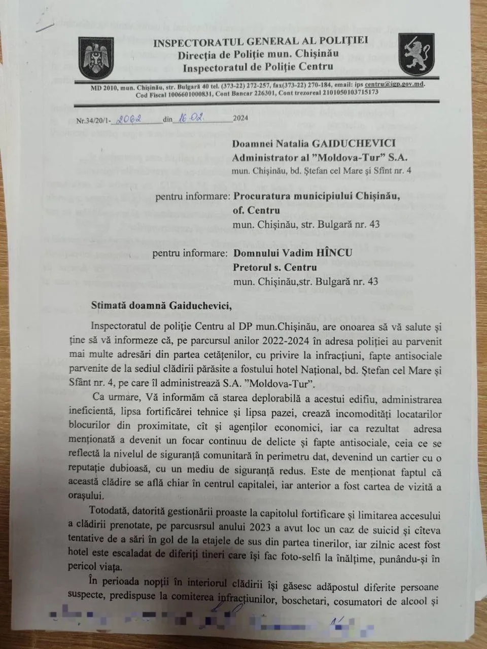 Totodată, au fost trimise numeroase sesizări către SRL „Moldova-Tur”, administratorul clădirii, pentru a securiza accesul și a împiedica intrarea persoane.