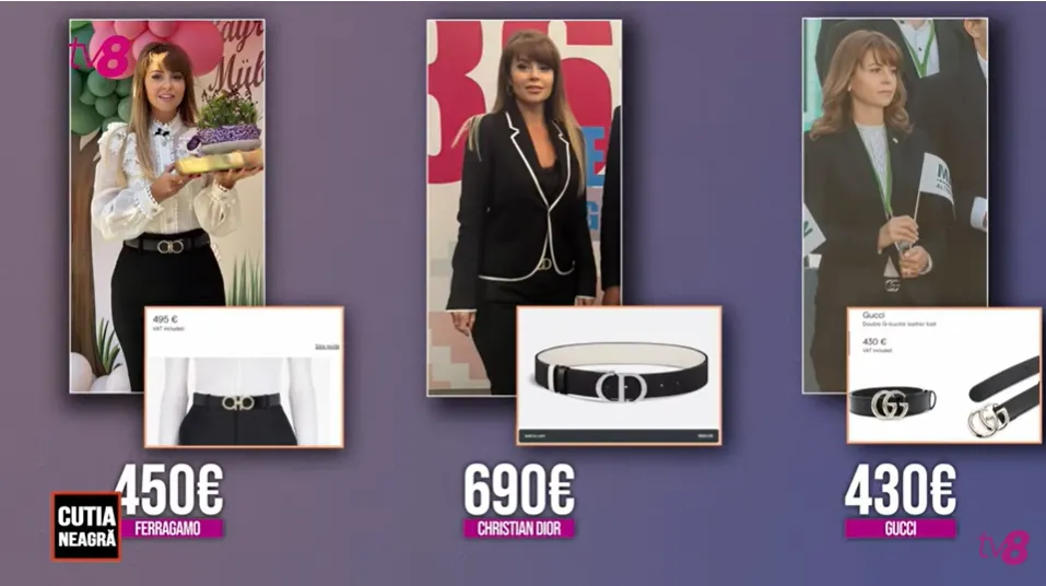 O curea Ferragamo de 450 de euro, una de la Christian Dior de 690 de euro și o centură Gucci de 430 de euro. Doar aceste trei curele fac aproape cât pensia minimă pe un an al unui vârstnic din Moldova.