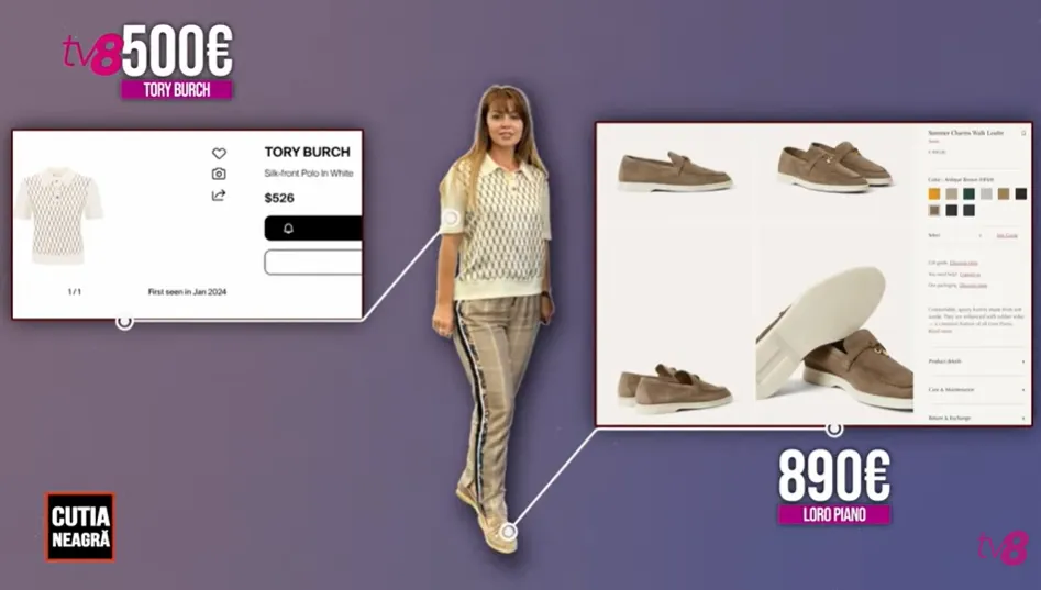Am găsit în colecția de încălțăminte a Irinei Gutnic și o pereche de pantofi de la Loro Piano. I-am identificat la prețul de 890 de euro pe siteu-l oficial al brandului. Viceprimarul i-a asortat cu un tricou-polo care poartă semnătura uneia dintre cele mai influente femei din fashionul american Tory Burch. Tricoul costă cam 500 de euro. Iată încă o ținută cât un salariu al bugetarei.