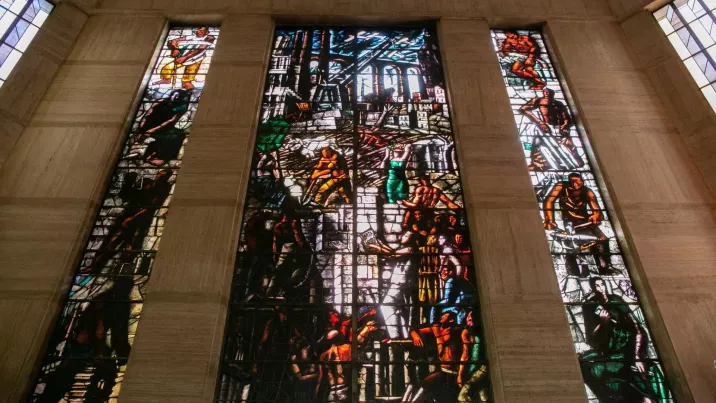 Lucrarea, realizată din mai multe vitralii, înfățișa personaje angajate în diverse meserii și arte.