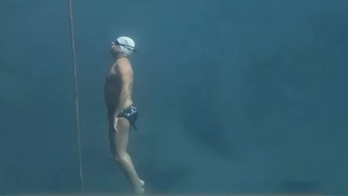 După câteva minute a atins adâncimea de 56 de metri, stabilind un record mondial la scufundarea sub gheață cu respirația ținută.