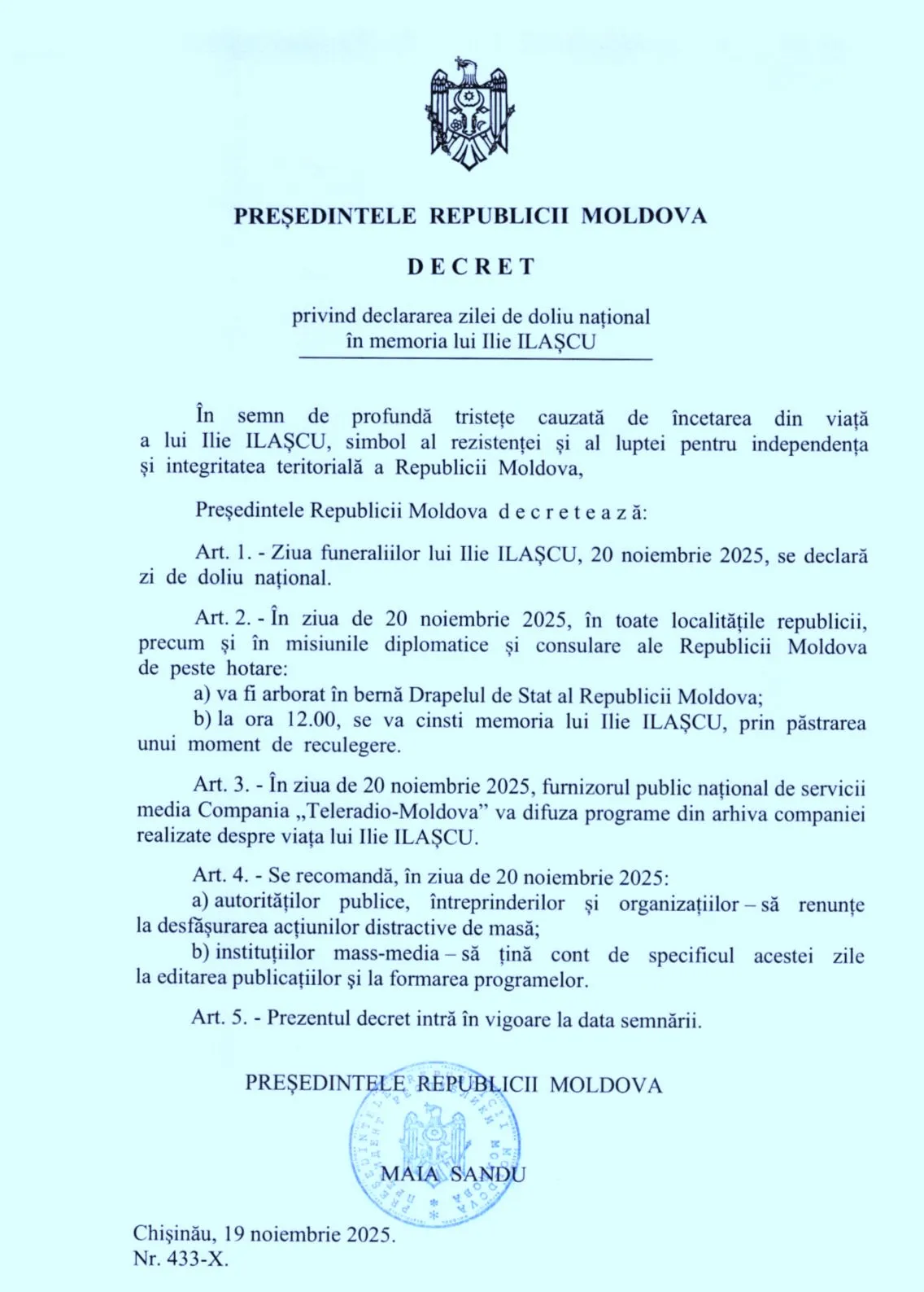 Zi de doliu național în Republica Moldova. Joi, 20 noiembrie, cetățenii își vor putea lua rămas-bun simbolic de la Ilie Ilașcu la Palatul Național, între orele 10:00 și 13:00