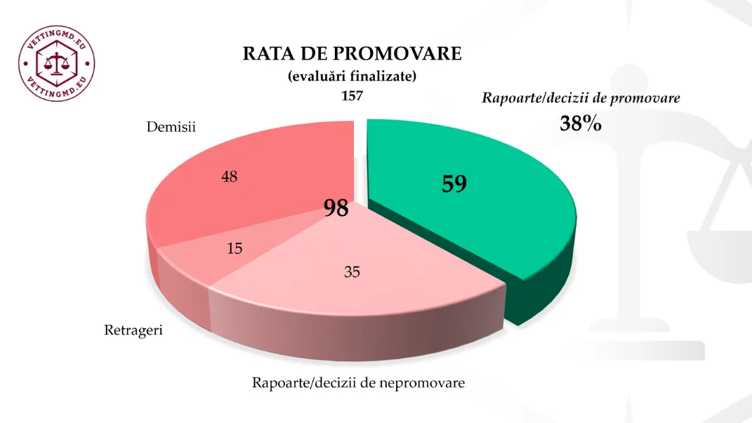Până la 17 noiembrie 2025, potrivit datelor publicate pe site-ul Comisiei Vetting, 181 de judecători și candidați au fost notificați despre startul evaluării integrității etice și financiare. Dintre aceștia, 59 au primit verdict de promovare, iar 35 nu au trecut filtrul. Alți 63 de magistrați au demisionat ori s-au retras din concurs.