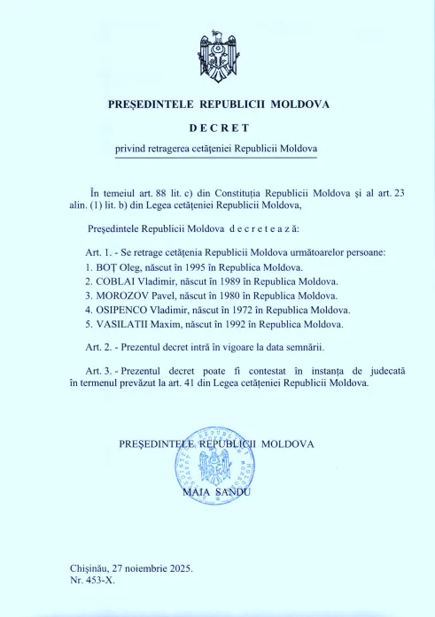 Cinci persoane au rămas fără cetățenia Republicii Moldova. Un decret în acest sens a fost semnat de președinta Maia Sandu.