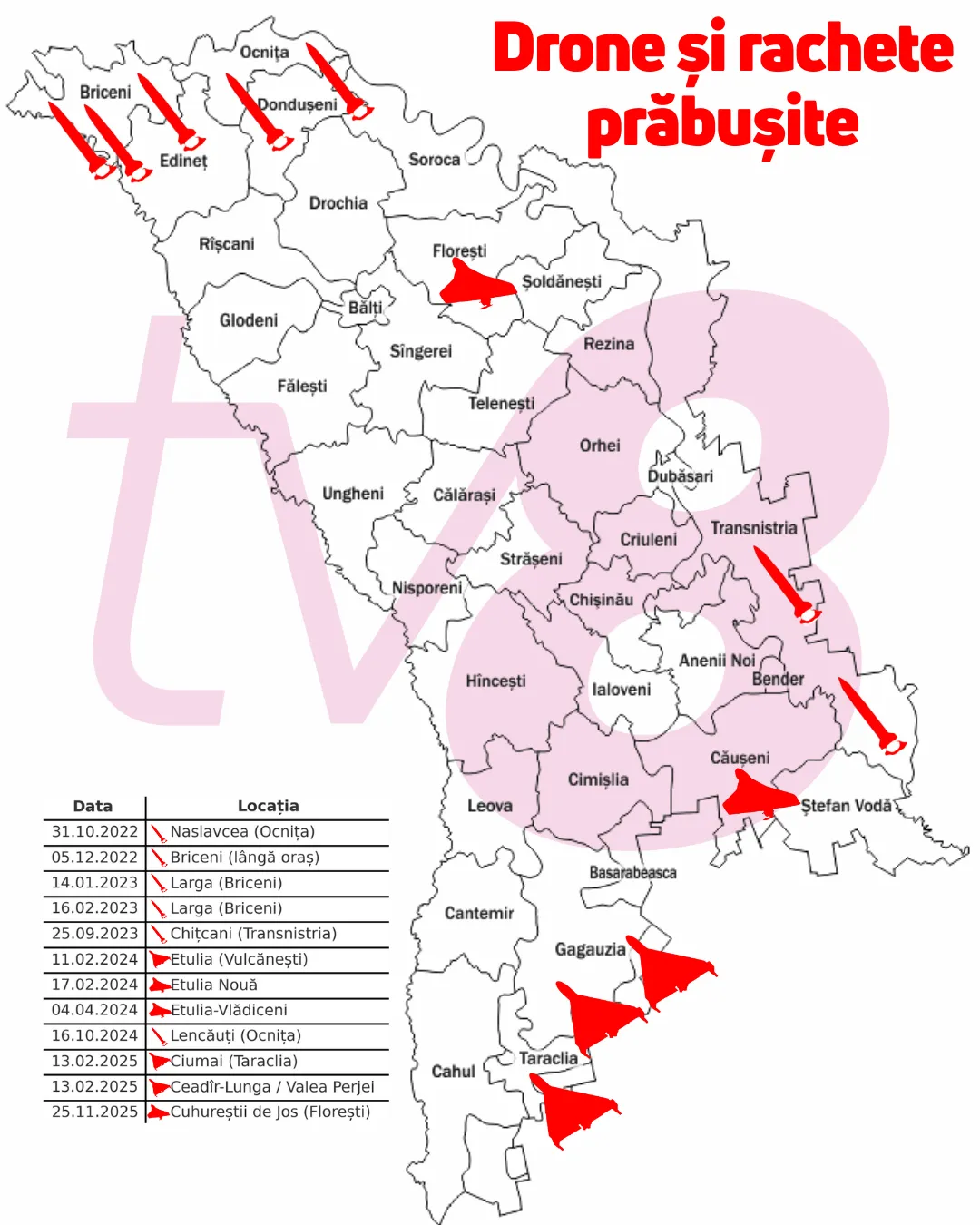 Harta dronelor și rachetelor găsite prăbușite în Moldova de la începutul războiului Rusiei în Ucraina, februarie 2022