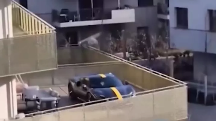 Inițial, locatarii complexului de apartamente au fost atrași de zgomotele puternice, după care au asistat la o scenă surprinzătoare. Mașina de lux a fost ridicată în mijlocul curții, pentru ca apoi să fie „parcată” pe balconul apartamentului de la etajul 1.