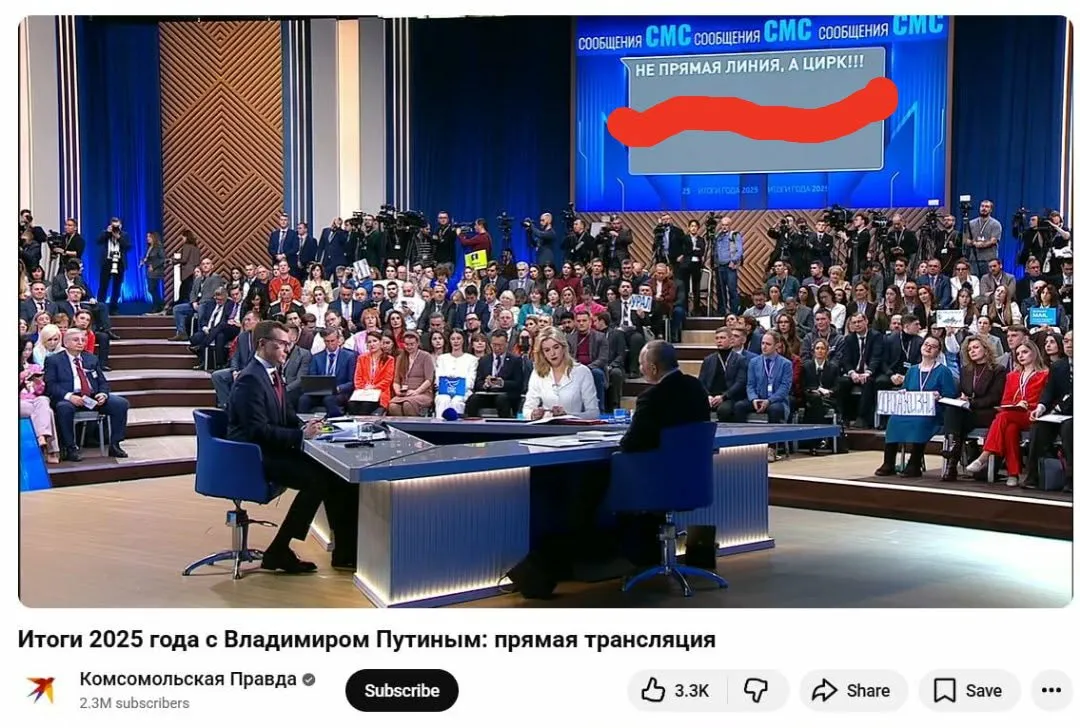 UPDATE Mesaje sarcastice au apărut pentru scurt timp pe un ecran mare în sala unde președintele rus Vladimir Putin își ținea conferința de presă anuală și conversația telefonică „în linie directă” cu cetățenii, vineri, anunță Reuters. „Nu o linie directă, ci un circ”, spunea un astfel de comentariu. Un altul, folosind prenumele și patronimicul lui Putin, suna astfel: „Vladimir Vladimirovici, e deja vineri, putem să bem ceva?” Comentariile neașteptate au apărut pe ecrane care afișau mesajele text primite, destinate lui Putin la evenimentul anual maraton, cu ocazia căruia rușii obișnuiți sunt încurajați să trimită întrebări, scrie Libertatea.