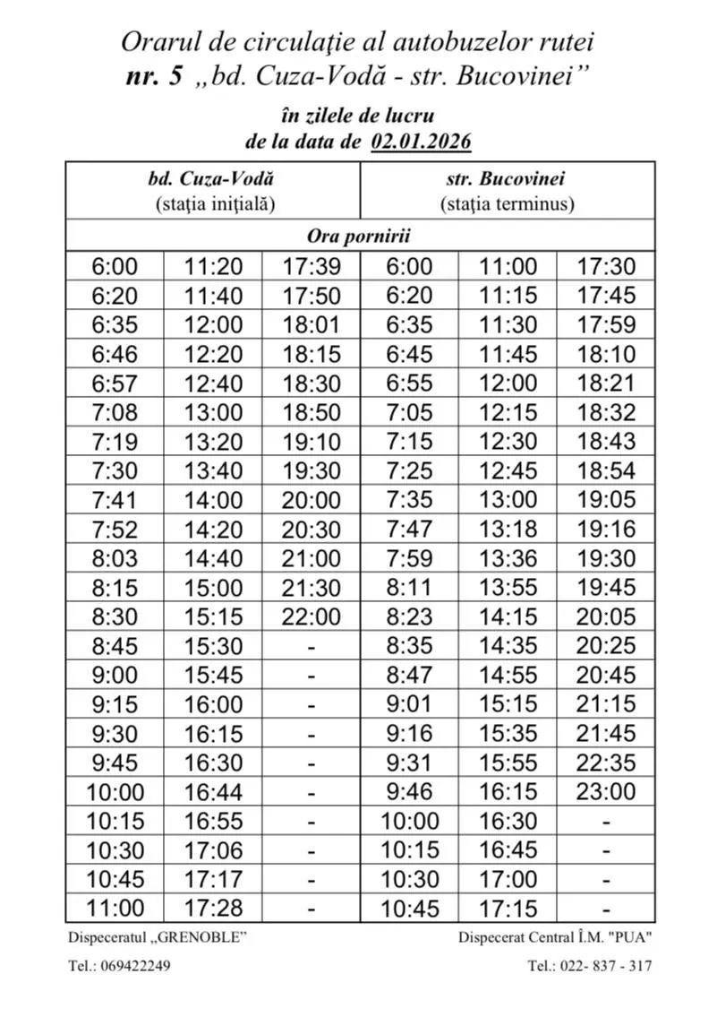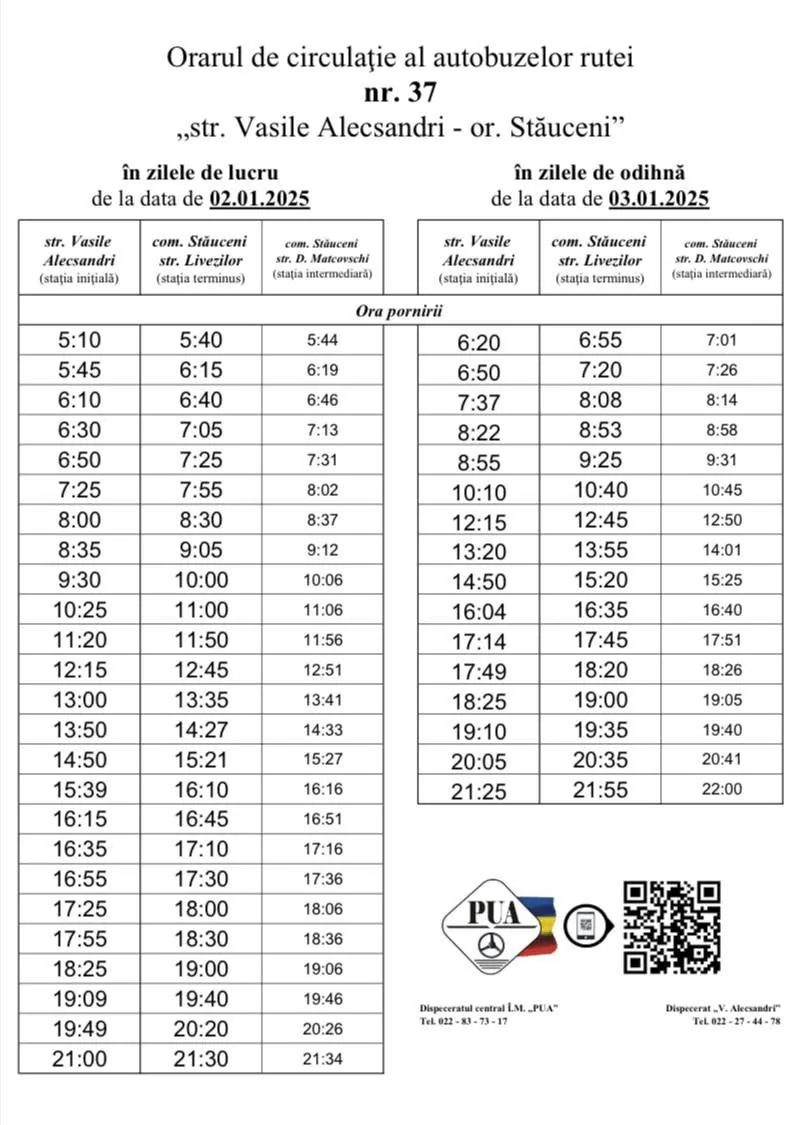 Modificări în orarul rutelor nr. 37 „str. Vasile Alecsandri - or. Stăuceni” și a nr. 5 „bd. Cuza-Vodă - str. Bucovinei”. Potrivit unui document emis de Primăria Chișinău, din 2 ianuarie, autobuzele menționate vor circula după un nou grafic.