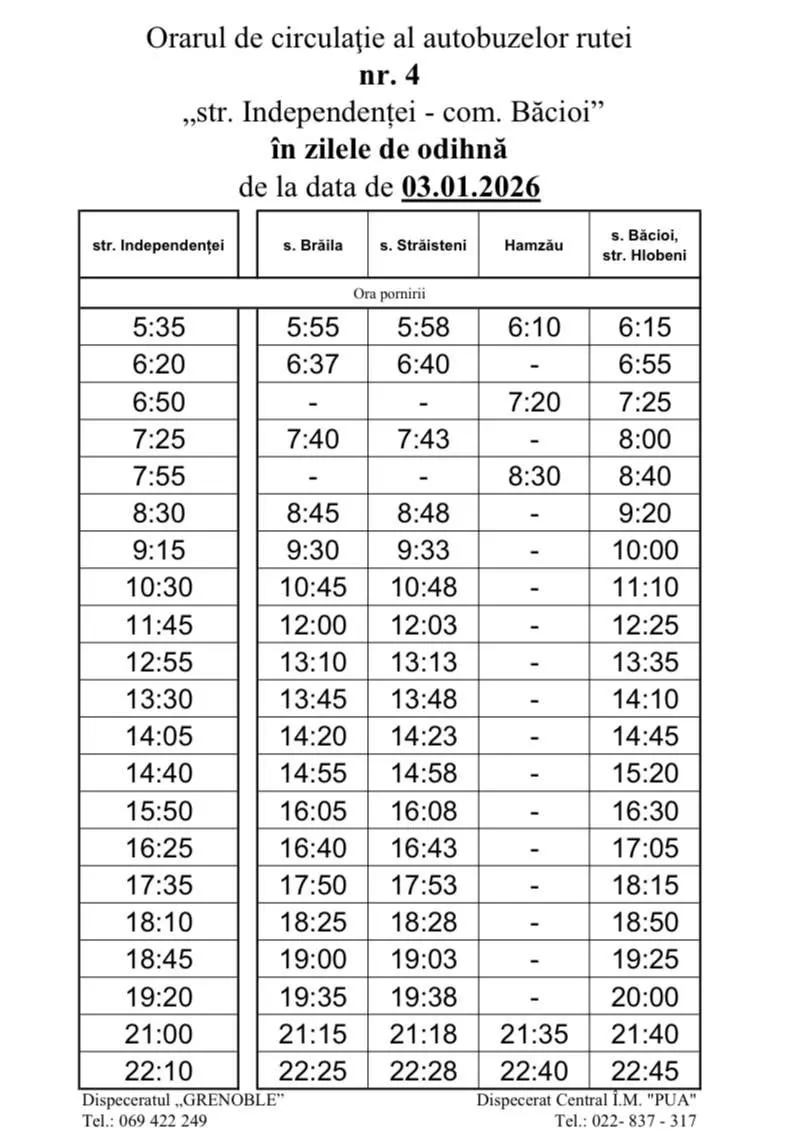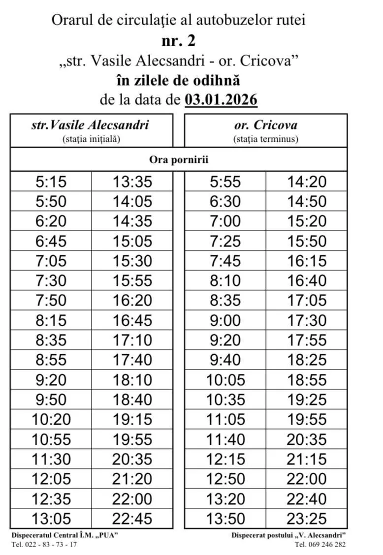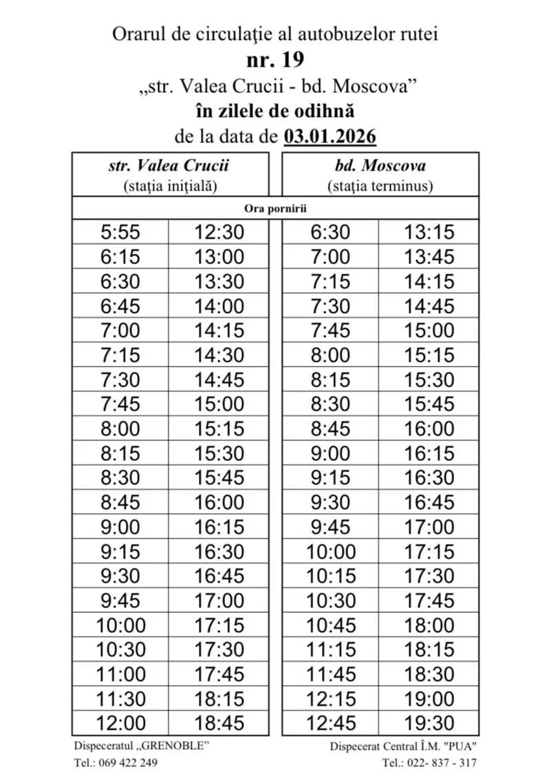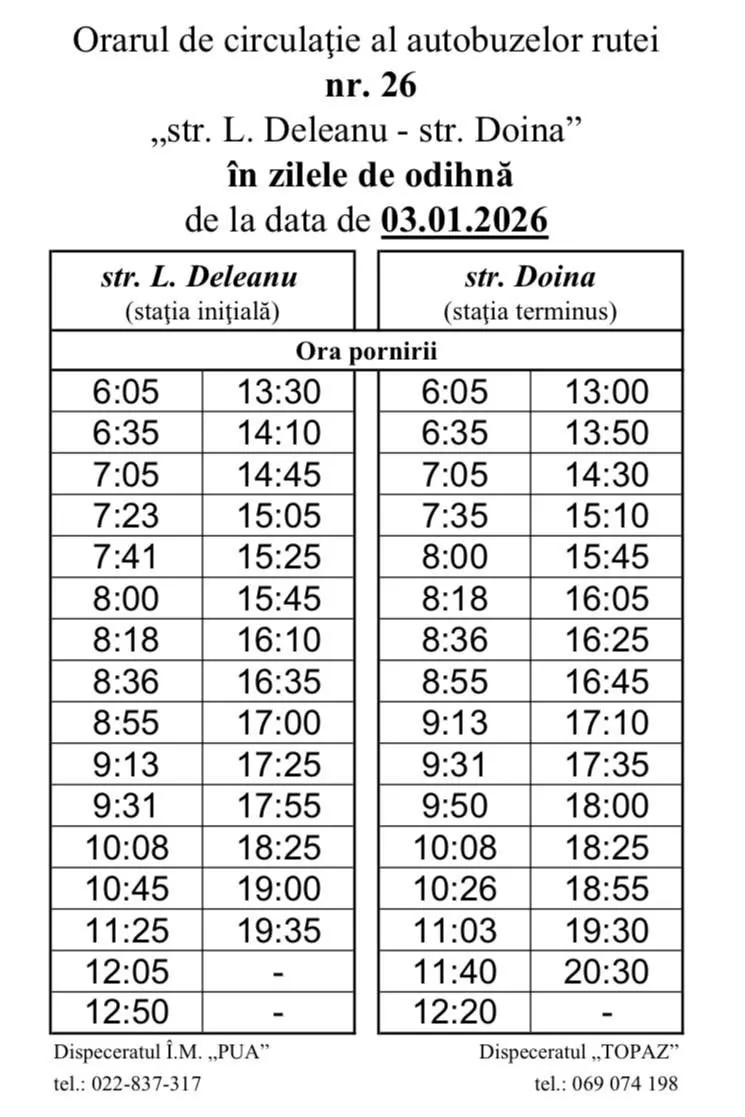 Mai mult, începând cu 3 ianuarie, vor fi operate modificări în orarul zilelor de odihnă a rutelor de autobuz nr. 2, 4, 19 și 26.