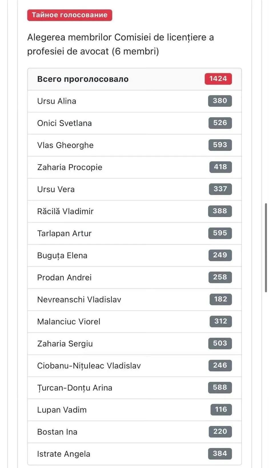 Totodată, din partea Congresului au fost aleși 6 membri în Comisia de licențiere a profesiei de avocat: Artur Tarlapan – 595, Gheorghe Vlas – 593, Arina Țurcan-Donțu – 588, Svetlana Onici – 526, Sergiu Zaharia – 503 și Procopie Zaharia – 418.
