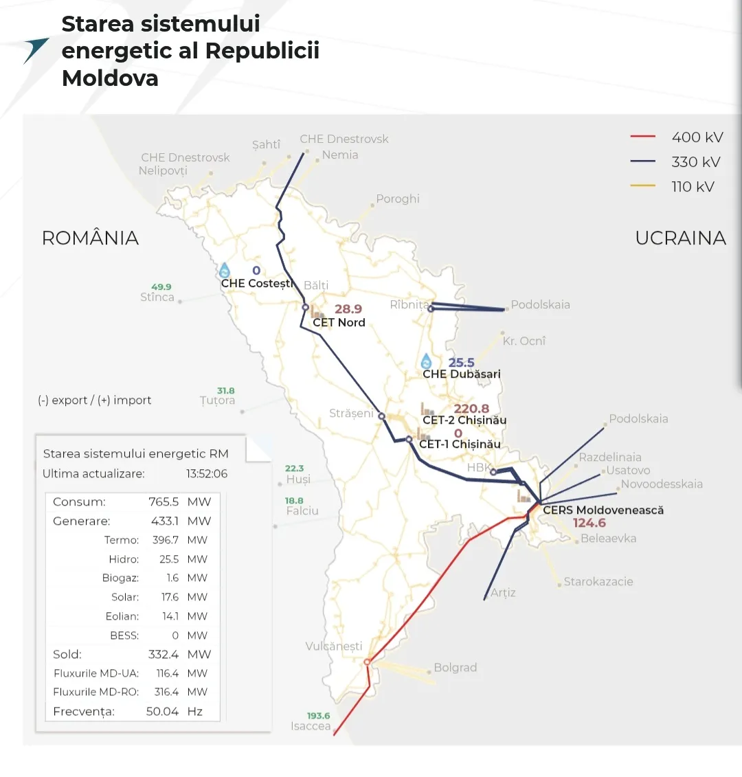 UPDATE Surse din sistemul energetic din România au declarat pentru Economica.net că acum se lucreaz la realimentrarea locurilor de consum cu energie din România. De altfel, după cum se vede și în graficele Transelectrica, se exportă energie electrică în Moldova inclusiv prin cele trei linii de medie tensiune care trec Prutul. La momentul redactării acestei știri, către rețeaua moldoveană iese din Româna energie la o putere de 185 MW.
