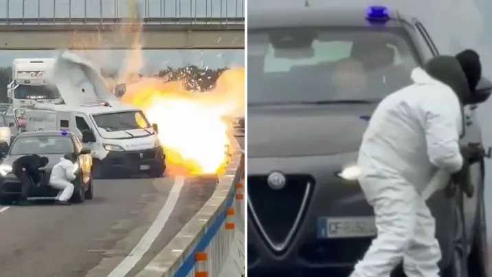 /VIDEO/ Jaf ca în filme pe o autostradă din Italia: Hoții au blocat drumul și au aruncat în aer mai multe mașini