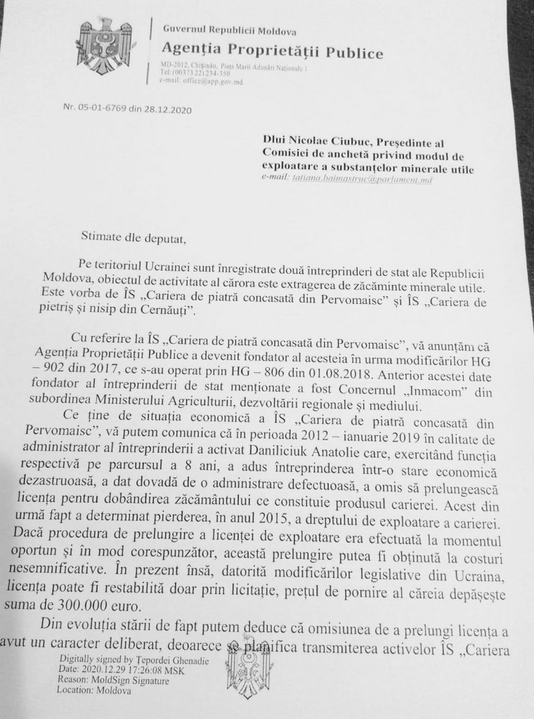 По его словам, государственные предприятия Cariera de piatră concasată в Первомайске и Cariera de pietriș și nisip в Черновцах (карьер по добыче щебня и песчано-гравийный карьер) стали элементом преступной схемы и Молдова фактически утратила контроль над этими активами.