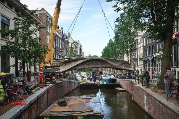 Первый в истории стальной мост, напечатанный на 3D-принтере, открылся в Амстердаме. Он был создан роботизированными манипуляторами с использованием сварочных горелок для послойного нанесения структуры. На его изготовление ушло 4500 кг нержавеющей стали.