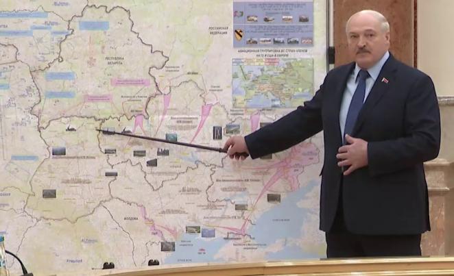 На сегодняшнем заседании Совета безопасности Александр Лукашенко продемонстрировал карту боевых действий в Украине. На ней видны "угрожающие Беларуси украинские силы" и направления российских ударов по Украине. Видеозапись с заседания опубликовали телеграм-канал «Пул первого».