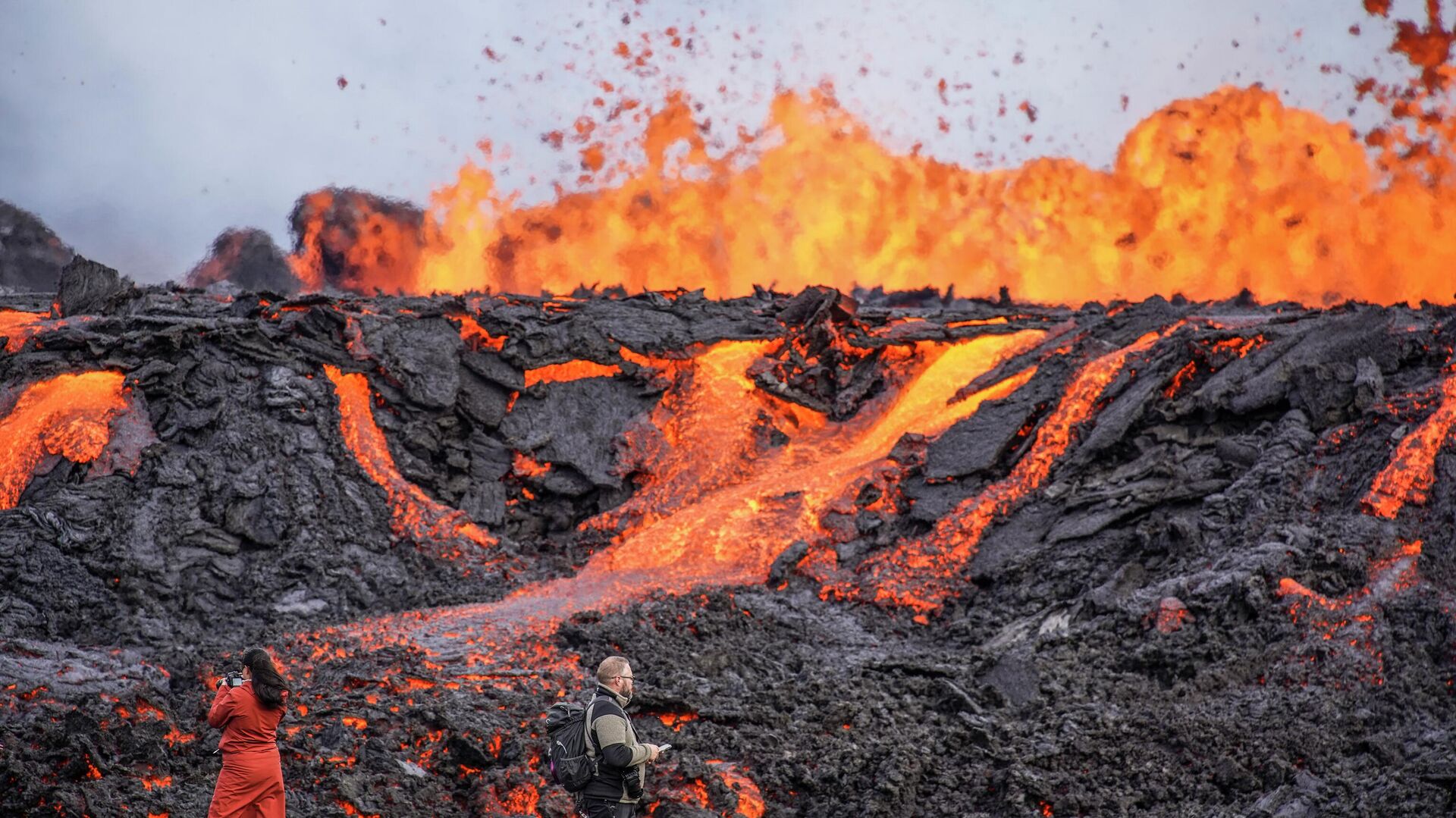 Несмотря на все предупреждения, люди подбираются довольно близко к растекающейся лаве, чтобы сделать снимки на память.