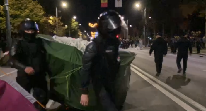 Полиция освободила проезжую часть от палаток, которые сегодня во время акции протеста установили сторонники партии "Шор". Протестующие не оказывали сопротивления.