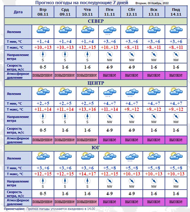 Атмосферное давление обещает быть повышенным, воздух прогреется до +13 на севере, +14 в центре и +15 на юге.