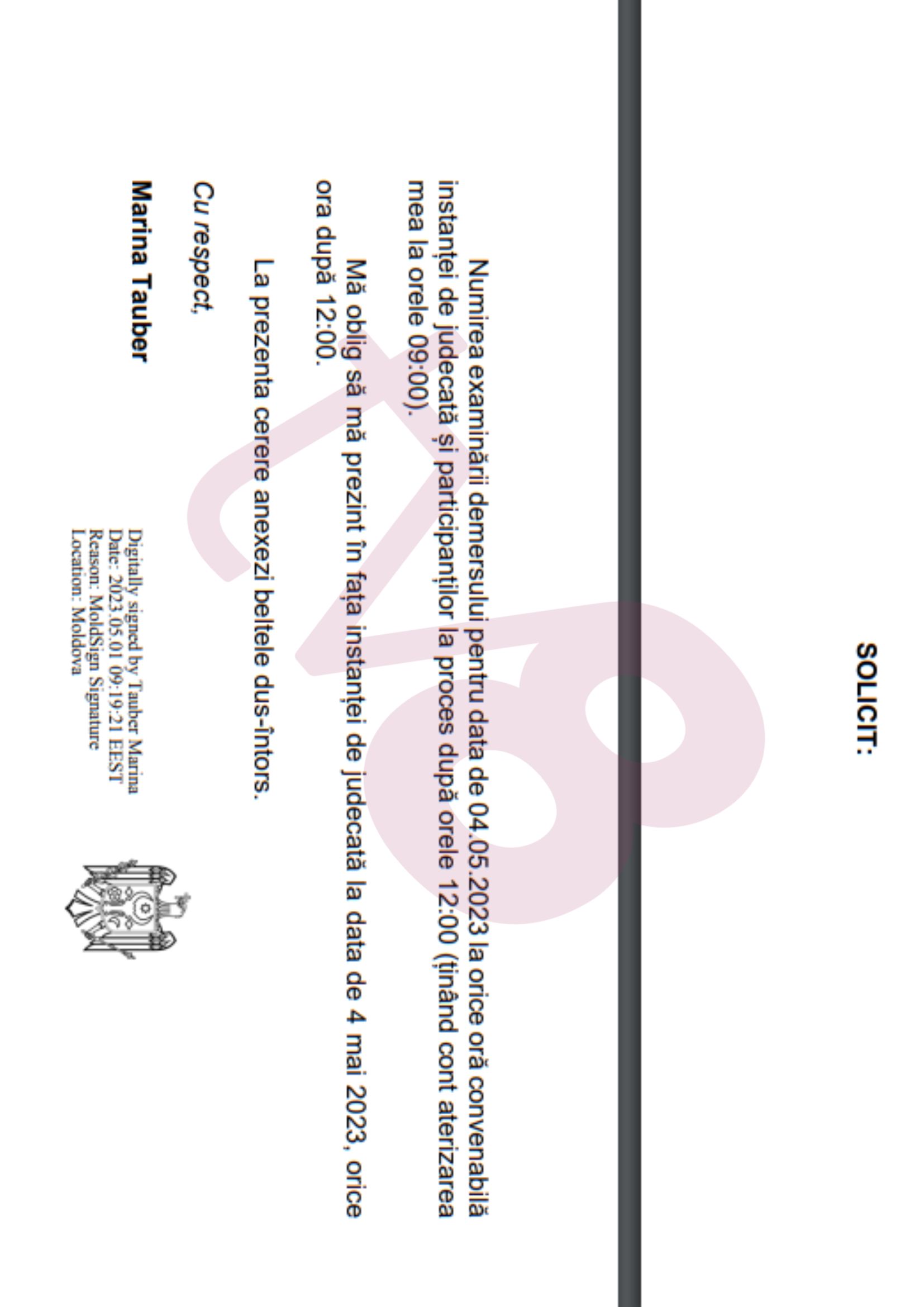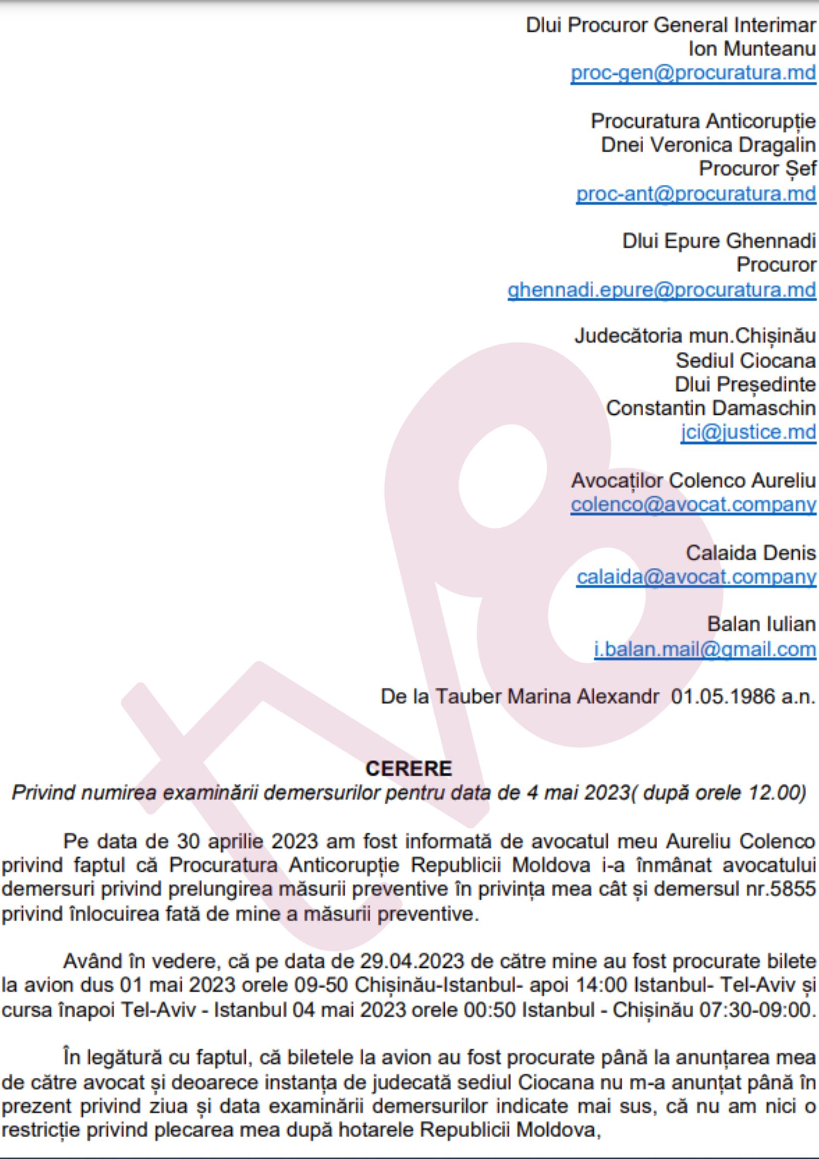 В распоряжении TV8.md оказался документ, где Таубер уведомляет, что 30 апреля Аурелиу Коленко проинформировал ее о том, что прокуратура по борьбе с коррупцией сообщила о подаче ходатайство на продлению меры пресечения и возможное изменение меры пресечения. Таубер же взяла на себя обязательства прийти на заседание суда 4 мая, чтобы судьи могли рассмотреть ходатайство прокуратуры.