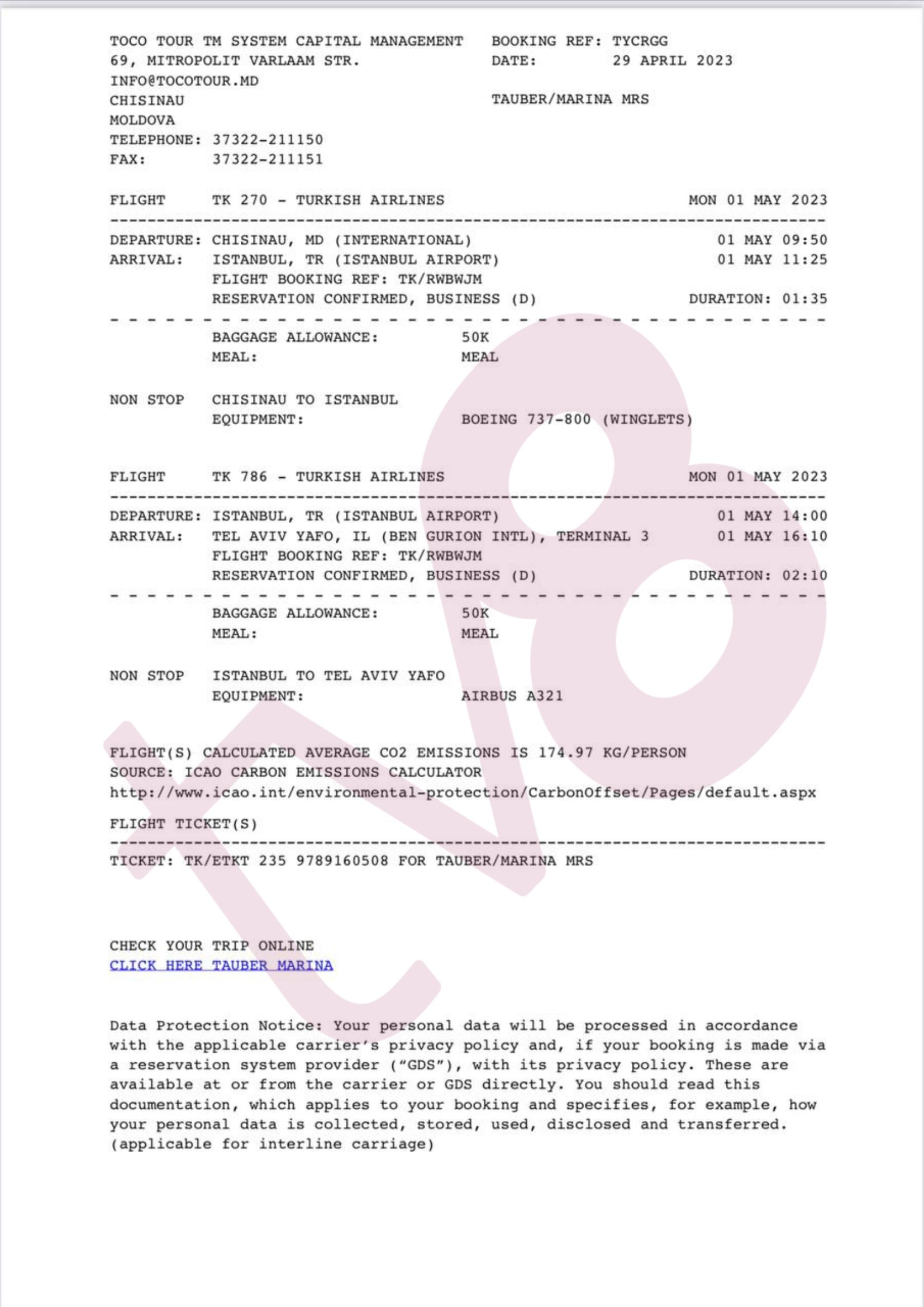 Депутат утверждает, что 29 марта приобрела билеты на самолет: 1 мая, 09:50 Кишинев-Стамбул - затем 14:00 Стамбул-Тель-Авив и обратный рейс Тель-Авив - Стамбул 4 мая, 00:50 Стамбул - Кишинев 07:30-09:00.