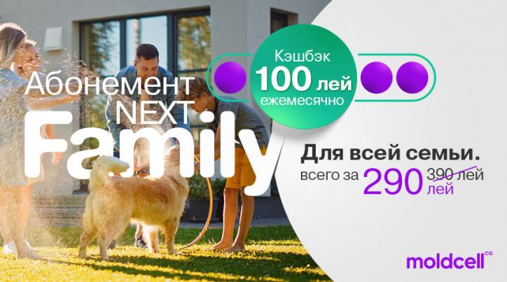 В Moldcell август месяц богат сюрпризами для всех абонентов! Компания запустила Абонемент Next Family – новый продукт, подходящий для всей семьи. Он позволяет подключить до 4 номеров и включает в себя большой объем услуг, скидки и бесплатные сервисы, все это по очень выгодной цене.