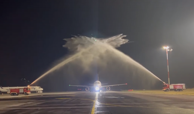 Вчера вечером прошел совершен первый рейс. Самолет встретили в Кишиневском международном аэропорту традиционным проходом через водяную арку.