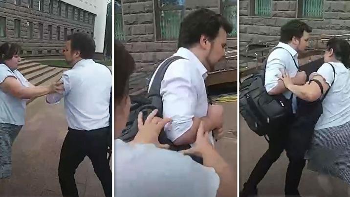 Перчун ответил женщине, что не может решить ее проблему, так как этими вопросами занимаются банки. Она, пытаясь помешать депутату зайти в парламент, начала его толкать.