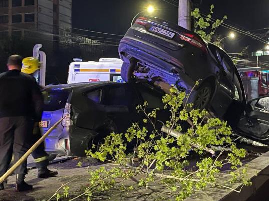 Удар был такой силы, что автомобиль Ford оказался на автомобиле Toyota. Оба авто столкнулись со фонарным столбом на тротуаре.