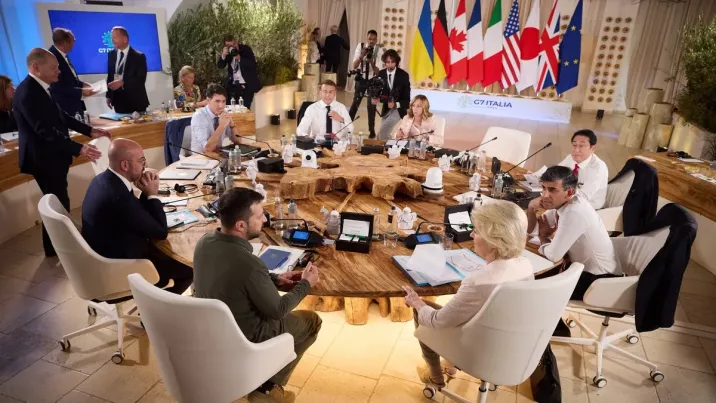 В ходе саммита лидеры стран G7 согласовали схему предоставления кредитов на сумму 50 миллиардов долларов для Украины, используя для погашения кредита проценты от российских суверенных активов, замороженных после агрессии Москвы в 2022 году.