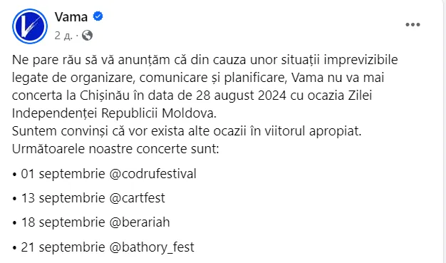 "Сообщаем вам, что, к сожалению, из-за непредвиденных организационных, коммуникационных и плановых проблем, группа Vama не сможет выступить в Кишиневе", - написали музыканты в фейсбуке.