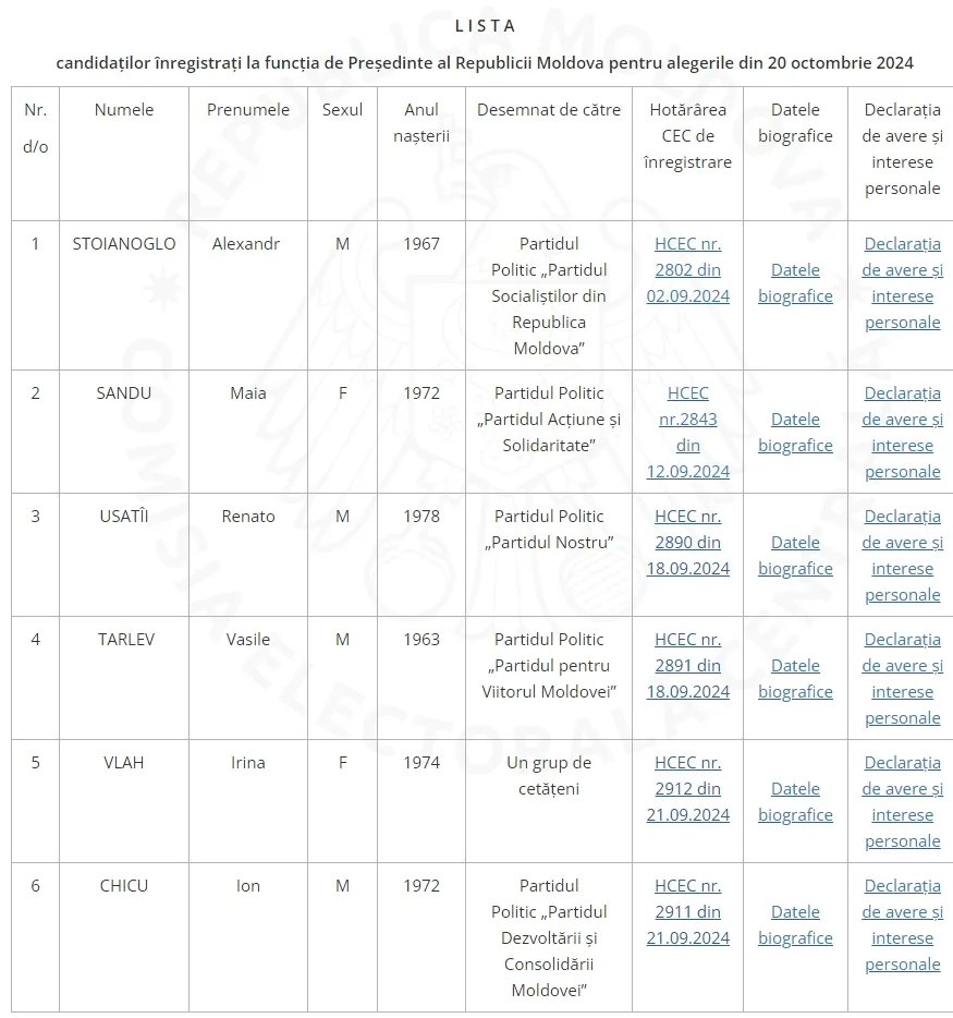 На данный момент Центральная избирательная комиссия допустила к выборам шесть кандидатов. Эти кандидаты прошли необходимые процедуры регистрации и соответствуют требованиям, установленным законодательством: