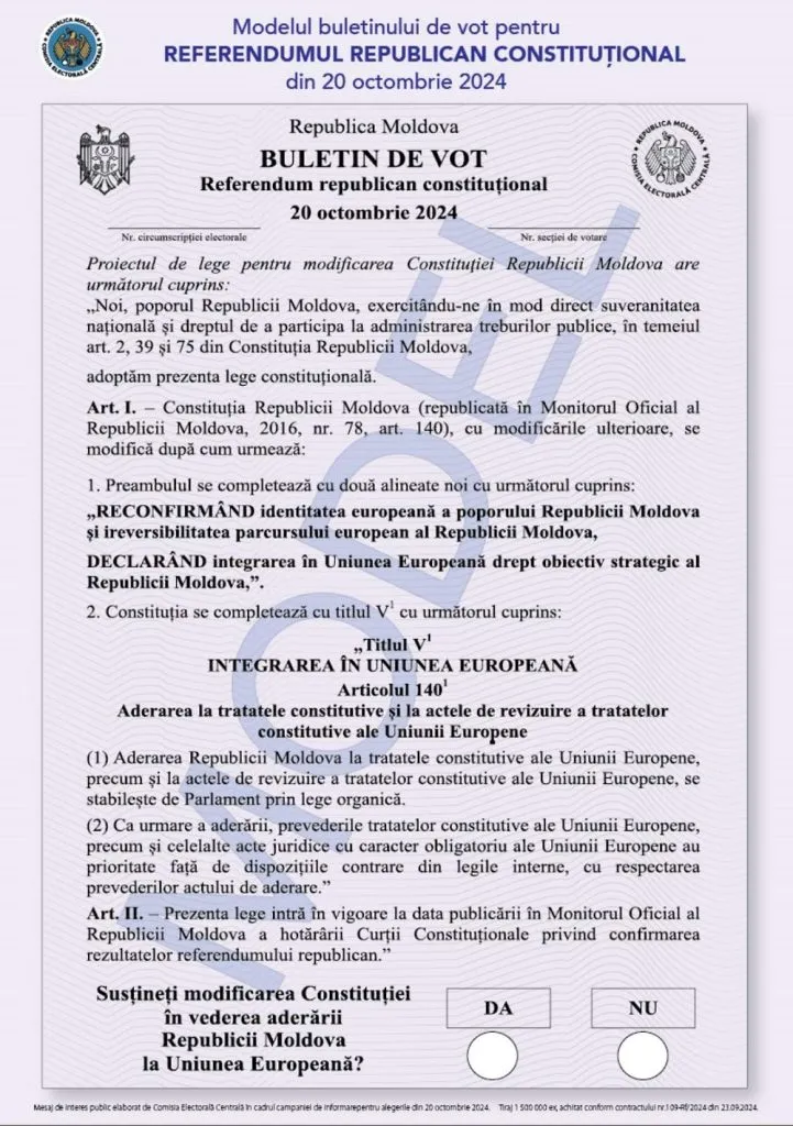 Гражданам предложено ответить на вопрос: "Поддерживаете ли вы внесение изменений в Конституцию с целью вступления Молдовы в Европейский Союз?". Ответить можно "Да" или "Нет", избиратель ставит штамп с надписью "Проголосовал" в круге.