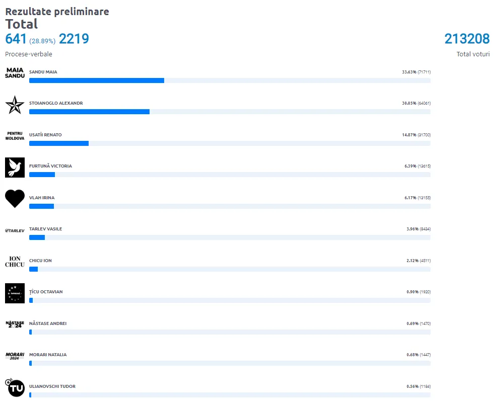 Обновлено. После обработки 54,75% голосов, лидирует Майя Санду с 35,88%. На втором месте Александр Стояногло — 29,07%. Далее следуют: Ренато Усатый (14,54%),  Ирина Влах (5,87%) и Виктория Фуртунэ (5,86%).