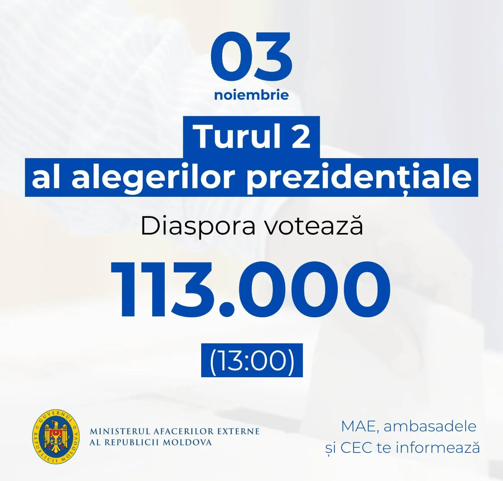 К 13:00 в диаспоре проголосовало более 113 000 избирателей. Об этом сообщил МИД Молдовы. За границей открыто 231 избирательный участок. Они будут работать до 21:00.
