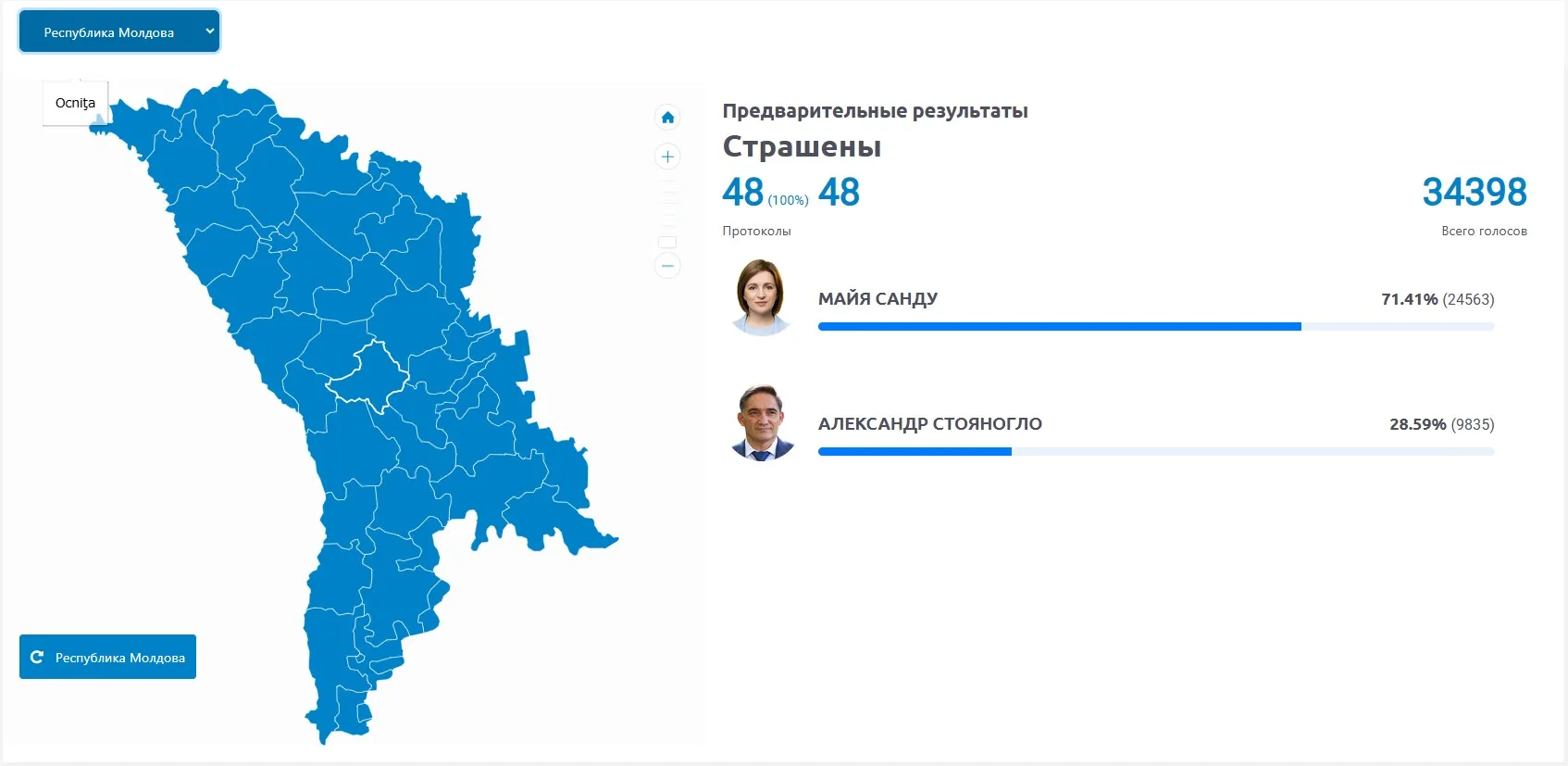 В пределах страны действующий президент и кандидат от PAS Майя Санду смогла заручиться максимальной поддержкой избирателей в Страшенском районе.