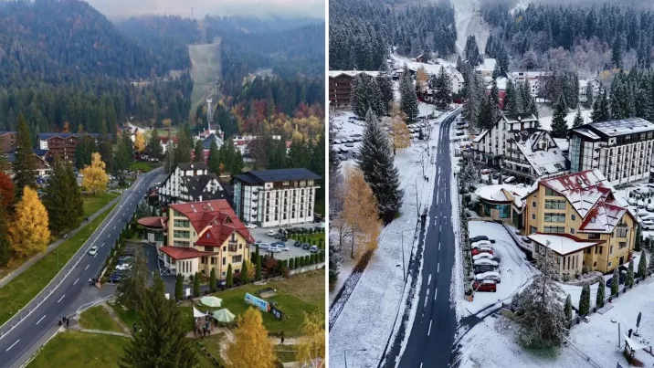 Из фотографий, опубликованных в социальных сетях, видно, как всего за несколько часов Пояна-Брашов из осеннего пейзажа превратилась в зимнюю картину, с тонким слоем снега, придающим горнолыжному курорту особую атмосферу.