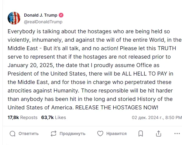 «Пусть это сообщение послужит подтверждением того, что если заложники не будут освобождены до 20 января 2025 года — даты, когда я с честью вступлю в должность президента США, — то для тех, кто совершил эти злодеяния против человечества на Ближнем Востоке, наступит жестокая расплата. Ответственные за это пострадают сильнее, чем кто-либо за всю долгую и богатую историю США», — написал Трамп в своей соцсети.