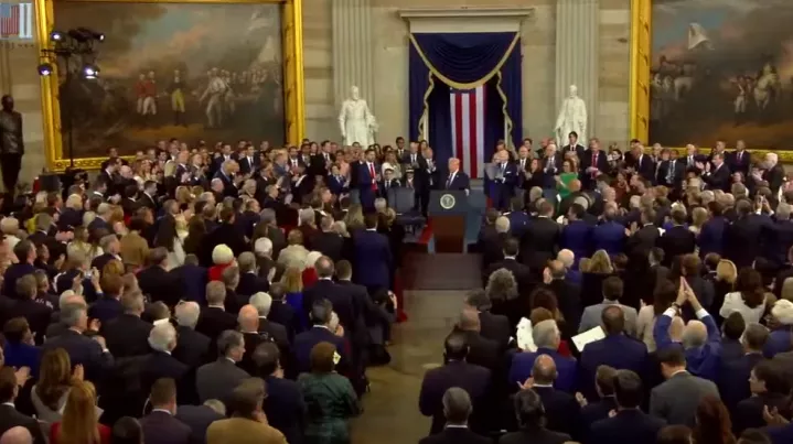 Обычно инаугурации президентов США проходят на ступенях Капитолия, но в этот раз, из-за морозной погоды, церемонию провели внутри здания — в зале под куполом Капитолия.