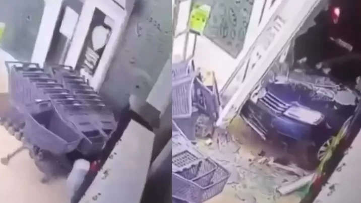 Din imagini se vede cum femeia deschide ușa pentru a ieși din magazin, dar observă cum mașina vine cu viteză spre ea. Automobilul de model Volkswagen a distrus intrarea magazinului și a intrat înăuntru.