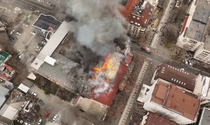 В центре столицы утром 13 марта вспыхнул сильный пожар. Загорелось здание ресторана на пересечении улицы Колумна и пешеходной улицы Еуджен Дога.