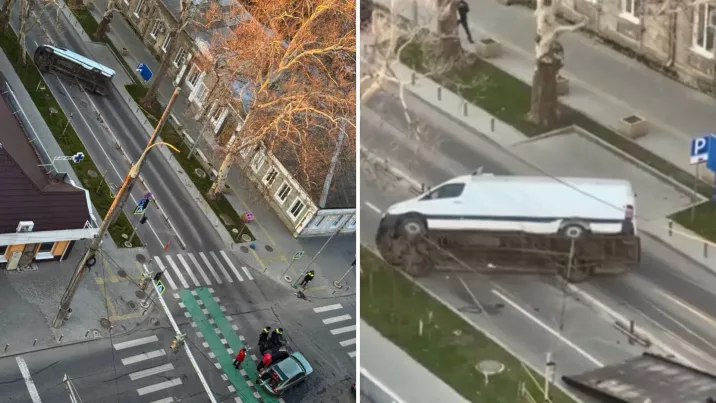/ВИДЕО/ В центре Кишинева перевернулся микроавтобус после столкновения с легковушкой