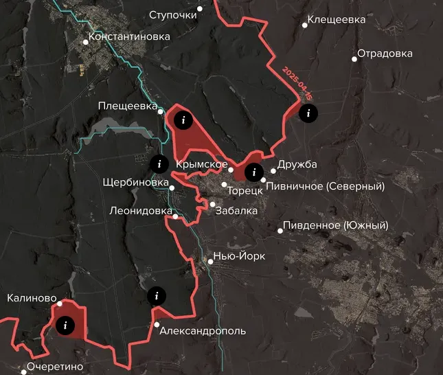 Институт изучения войны (ISW) сообщает, что российские войска используют передислоцированные подразделения 8-й общевойсковой армии для ликвидации украинского выступа юго-западнее Торецка и атакуют Константиновку с юга. Украинские силы вытеснены из большей части Торецка — в том числе из центра города, который ВСУ частично вернули под контроль во время контрнаступления в феврале. Российской армии удалось за несколько дней развить наступление, вклинились глубоко в оборону ВСУ между Торецком и Константиновкой. Силы РФ прорвались к Плещеевке на полпути к городу, бои продолжаются.