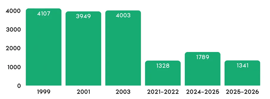 На 2025–2026 учебный год в Приднестровье предусмотрено 1341 бюджетное место в вузах — на 428 меньше, чем годом ранее (1769), и почти в три раза меньше, чем в конце 1990-х годов. Сокращение объясняют общим снижением количества абитуриентов и студентов, динамика снижение численности молодежи в регионе наблюдается уже долгие годы. Данные опубликовали местные власти.