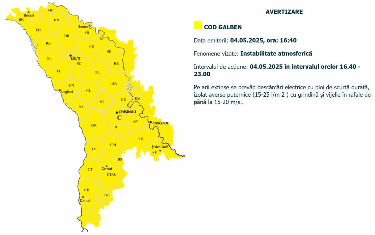 Новое метеопредупреждение. 4 мая почти до полуночи в Молдове ожидаются грозовые дожди, местами пройдет град. Синоптики объявили желтый код.