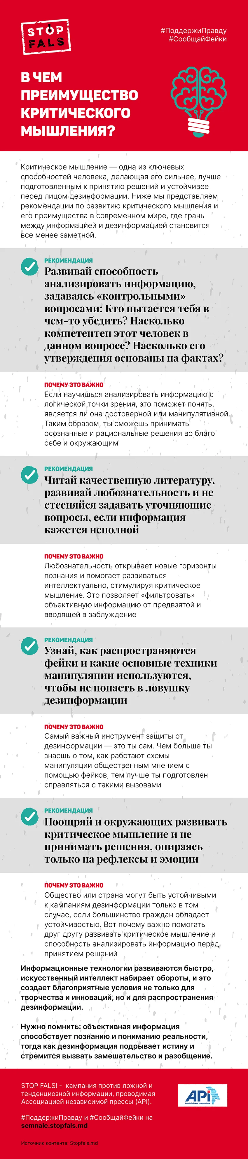 STOP FALS! - кампания против ложной и тенденциозной информации, проводимая Ассоциацией независимой прессы (API), представляет в инфографике несколько рекомендаций для развития критического мышления. #НетДезинформации #СообщаемФейки