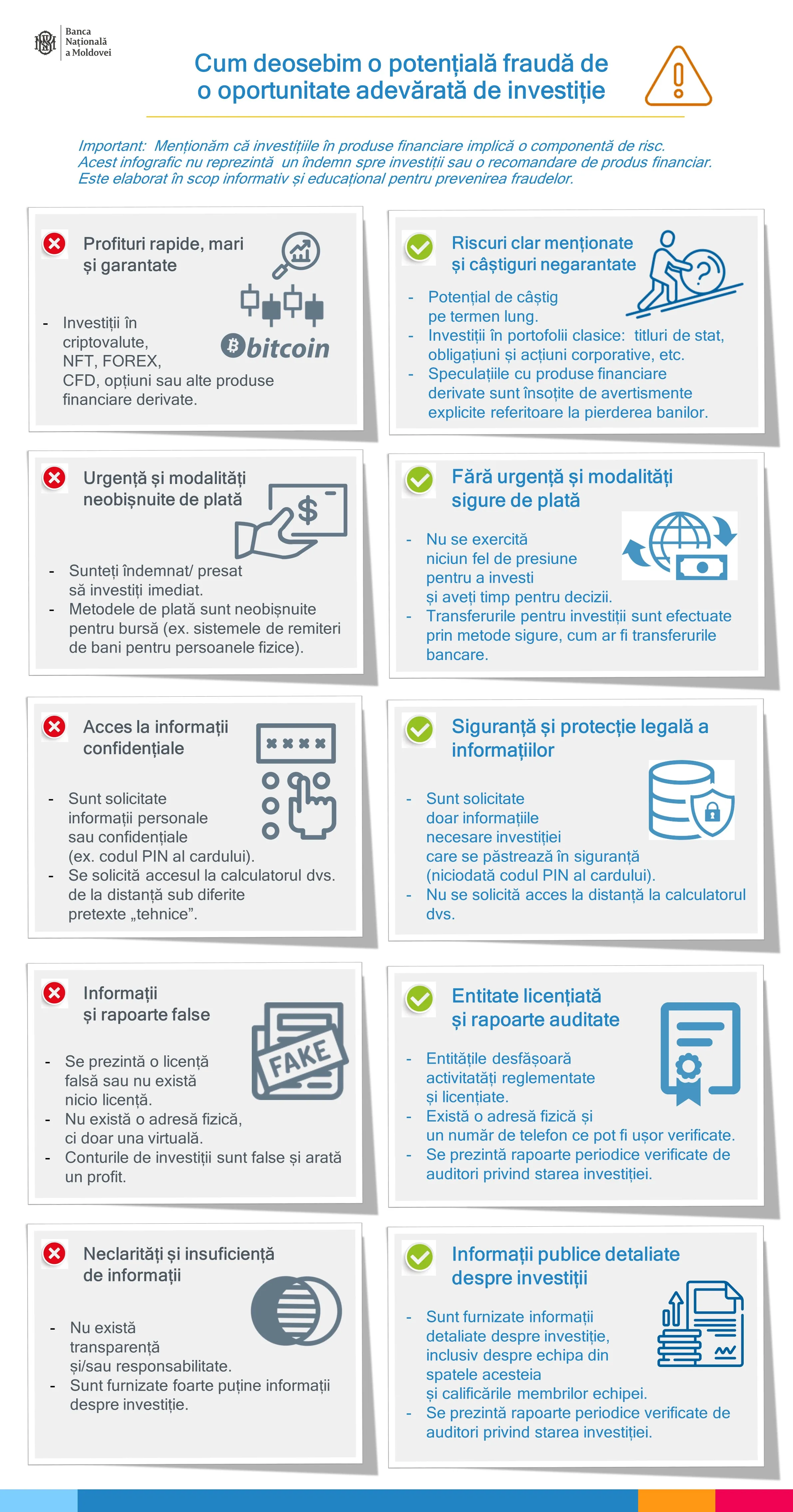 Не торопитесь — часто мошенники стремятся "отключить" критическое мышление пользователей, для этого ограничивают во времени принятия решения. Если вас торопят — это верный признак мошенничества. Перед инвестированием куда-либо, тщательно изучите информацию и проверьте наличие необходимых лицензий для осуществления подобной деятельности на территории Республики Молдова.