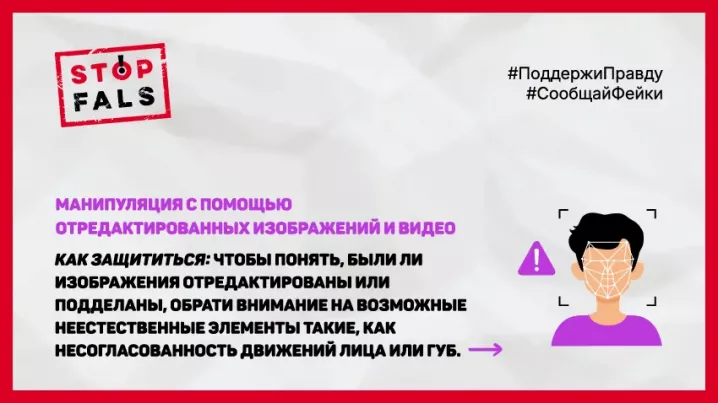 STOP FALS! - кампания против ложной и тенденциозной информации, проводимая Ассоциацией независимой прессы (API), предлагает в инфографике, представленной ниже, несколько простых методов обнаружения отредактированных изображений и видео. #НетДезинформации #СообщаемФейки